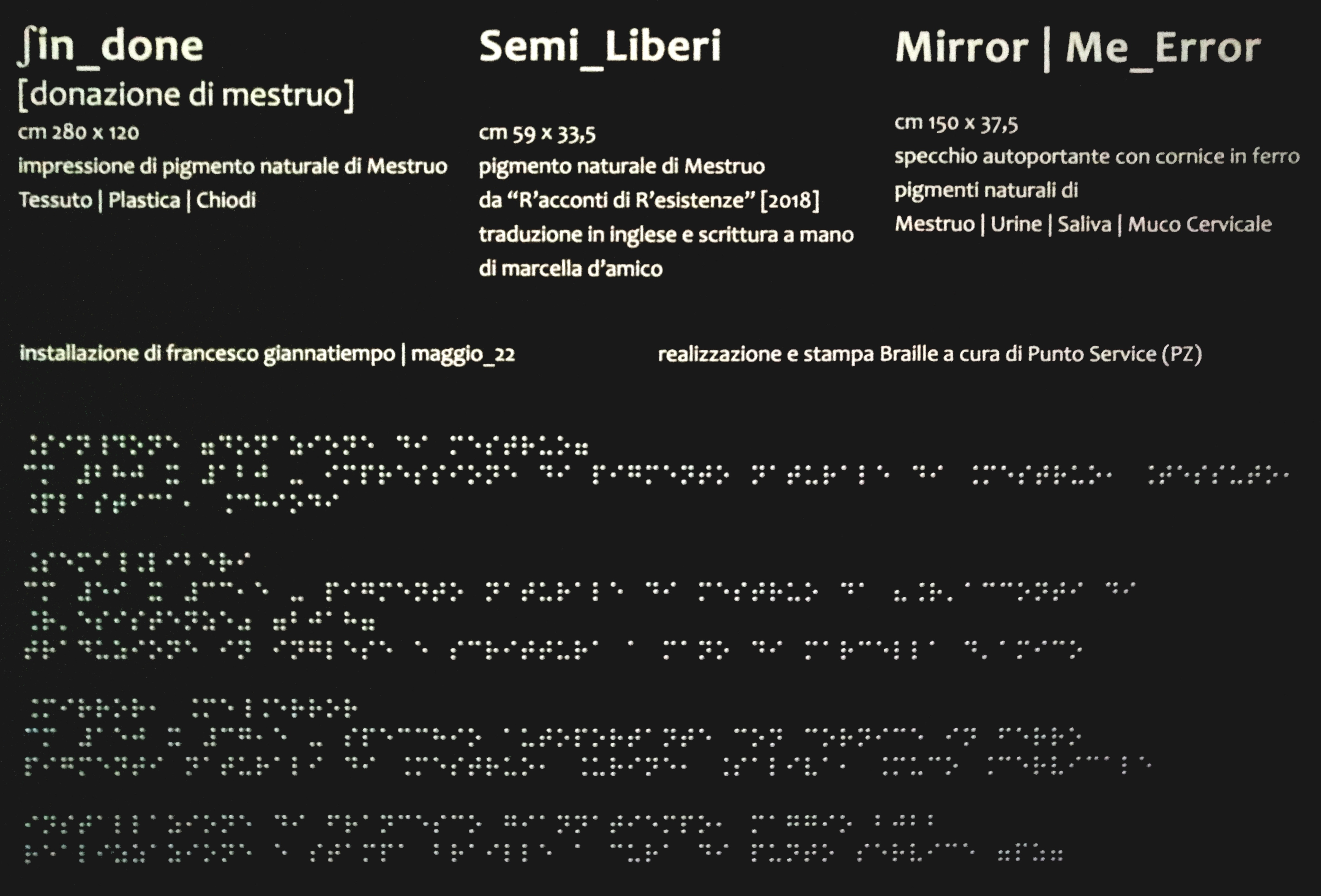 Grazie a quest’ultima sezione, tra le altre opere, sarà esposta come ospite Fuori Concorso Sin_done [donazione di mestruo] + Semi_Liberi + Mirror | Me_Error e verrà presentata domenica 02 ottobre alle ore 16.